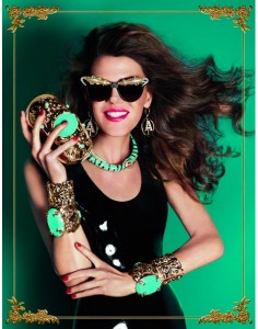 Com 50 peAi??as criadas para a H&M Anna trouxe formas animais para clutchs douradas, brocados para as armaAi??Ai??es dos A?culos de sol, jacarAi??s e cobras para pulseiras de festa e muito brilho para todas as peAi??as, inclusive para os sapatos que aparecem com salto alto, fivelas e tramas em dourado ou prata. Os preAi??os dos produtos variam entre U$25 e U$299 ai??i?? cerca de R$50 e R$600.