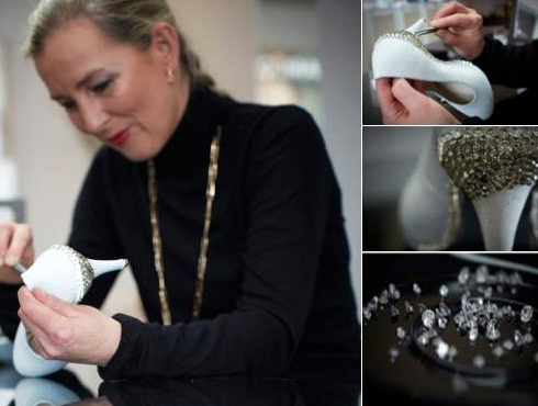 O sapato lanAi??ado pela designer em parceria com a joalheira Sarah Hutchings, da Orsini Fine Jewellery foi cravejado em diamantes brancos e feito minunciosamente Ai?? mA?o, com cola adesiva e uma pinAi??a.